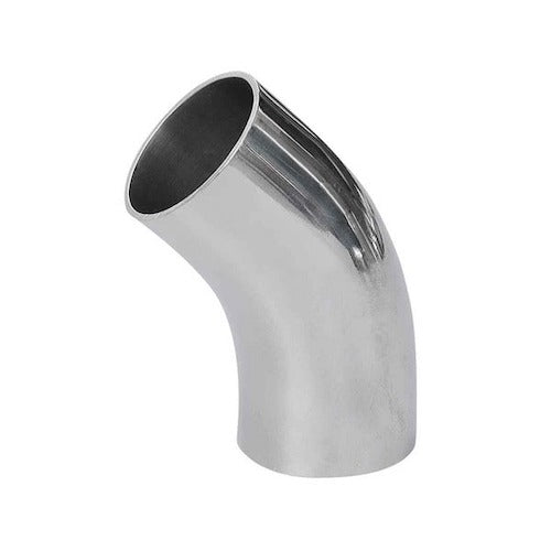 Our 3/4 inch 45° butt-weld elbow with tangents is a sanitary, 316L stainless steel elbow designed for high-purity connections in the food processing, brewing, industrial, and pharmaceutical industries.